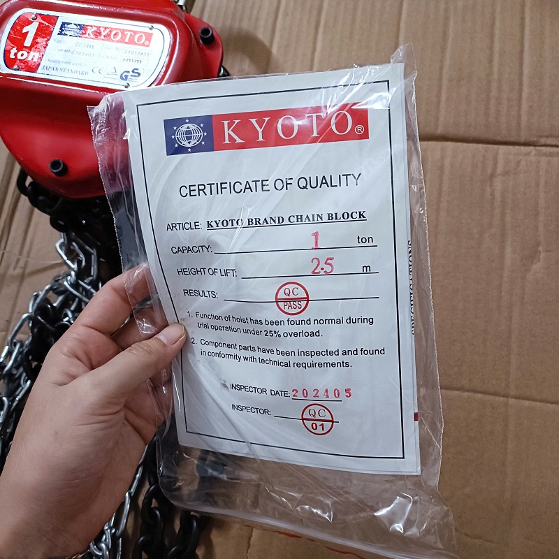 Pa lăng xích kéo tay Kyoto là thiết bị nâng hạ thủ công chất lượng cao, sản xuất theo tiêu chuẩn Nhật Bản, với các dòng sản phẩm có tải trọng từ 1 tấn và chiều dài xích tải 2.5 mét. Khách hàng tại TP.HCM có thể liên hệ hotline 0352.035.399 hoặc 0902.801.505 để được hỗ trợ tốt nhất.