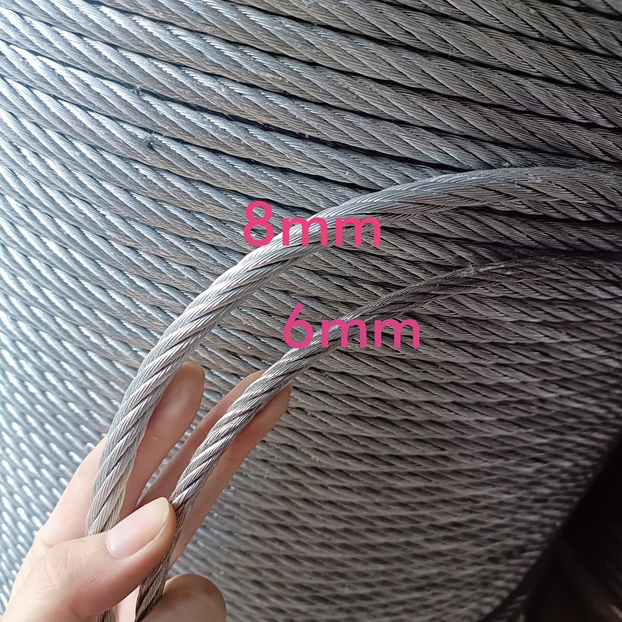 Sự khác biệt chính là lớp phủ bảo vệ bên ngoài. Cáp mạ kẽm 8 ly chỉ có lớp phủ kẽm chống gỉ cơ bản. Cáp bọc nhựa 8 ly có thêm một lớp vỏ nhựa dày bọc bên ngoài lớp mạ kẽm, cung cấp khả năng chống ăn mòn vượt trội hơn hẳn (đặc biệt là chống nước, hóa chất, tia UV, mài mòn), bề mặt trơn nhẵn và tính thẩm mỹ cao hơn. Cáp bọc nhựa thường được ưu tiên trong môi trường ẩm ướt, ngoài trời liên tục, hoặc các ứng dụng cần bảo vệ cáp tối đa, đồng thời có giá thành cao hơn cáp mạ kẽm.
